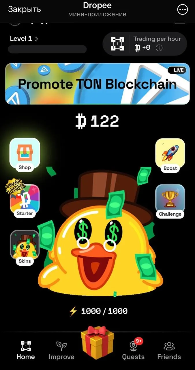 Dropee - це міні-додаток всередині Telegram, від команди біржі Bitrue. Основна мета проєкту - надати доступний та інтуїтивно зрозумілий інтерфейс для взаємодії та заробітку всередині додатка, завдяки різним ігровим механікам. Dropee за внутрішнім устроєм нагадує вже існуючі міні-додатки X Empire і Hamster Combat, адже основними способами заробітку ігрової валюти є - прокачування ігрових карт, виконання квестів, реферальна система, пасивний майнінг, механіка тапання по персонажу і рулетка зі спінами.