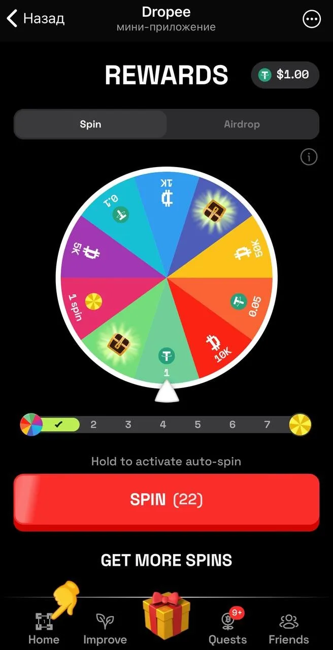 Активність у грі (рулетка): Ключовою відмінністю Dropee від багатьох інших міні-застосунків є можливість заробітку не тільки завдяки аірдропу токенів проєкту в майбутньому, а й у режимі реального часу, граючи в рулетку за накопичені спіни, в ній можна отримувати ігровий інвентар та найголовніше USDT у кількості від 0.05 до 100 USDT.