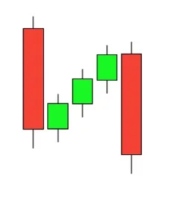 Falling Three Methods - протилежний патерн, що вказує на продовження ведмежого тренда.