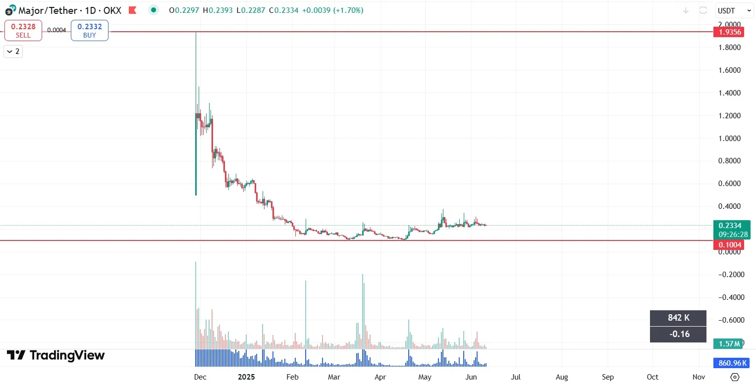 Яка поточна ціна MAJOR? На ф’ючерсах MAJOR торгується за ціною близько $0.23 у період консолідації між $0.2 і $0.3.