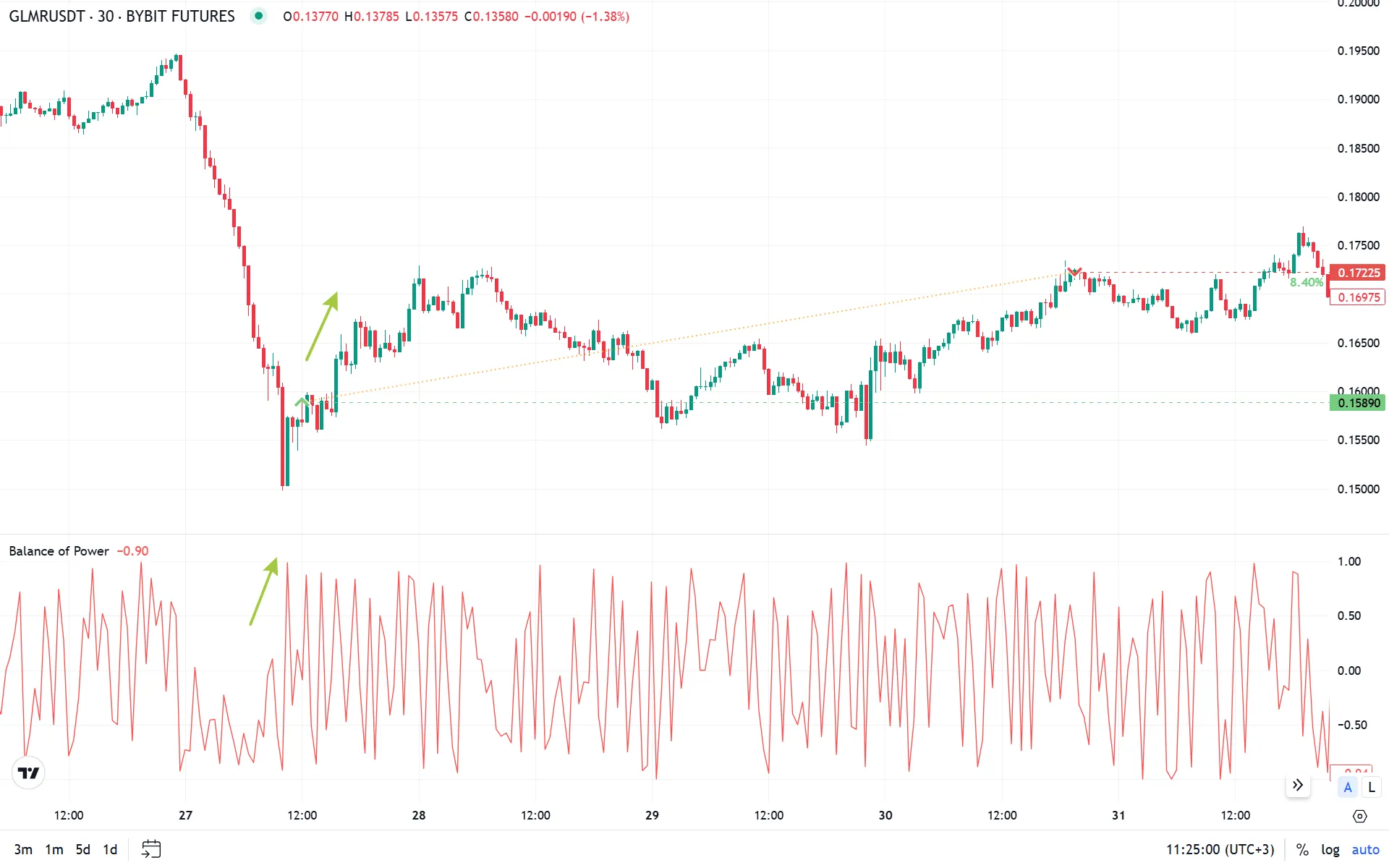 Баланс сил (BOP) — це індикатор, який оцінює співвідношення сил покупців і продавців. Він коливається навколо нульової лінії: позитивні значення вказують на домінування бичачого тренду, а негативні — на ведмежий.