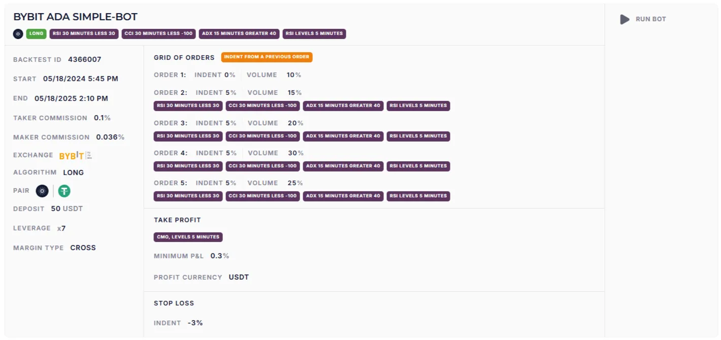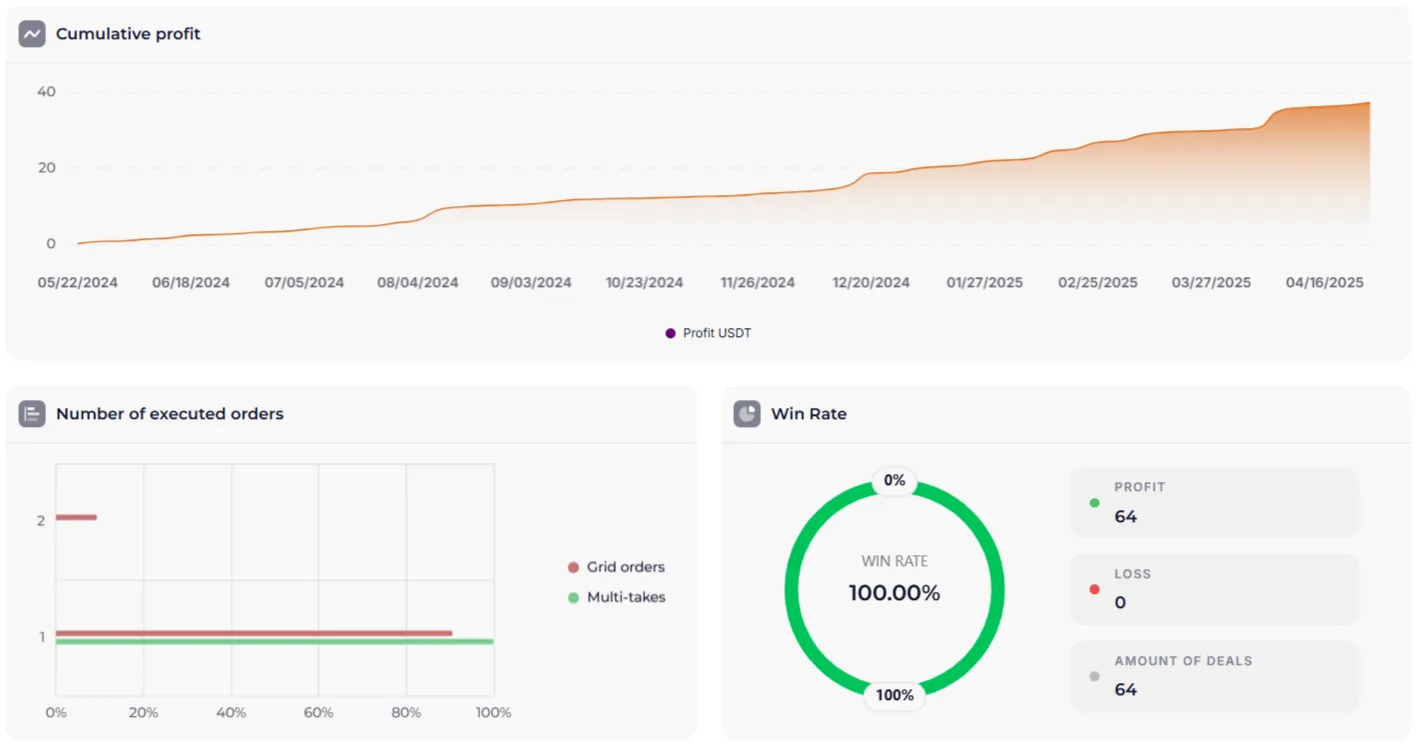 Коли всі умови сходяться, бот починає поступове нарощування позиції через сітку ордерів. Це дозволяє знизити середню ціну входу і збільшити прибутковість угоди.