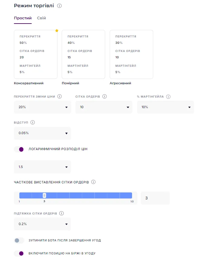 3. ми поставили невелике перекриття і 10 ордерів. А також використовували логарифм, щоб більше ордерів було притиснуто до точки продажу першого ордера.