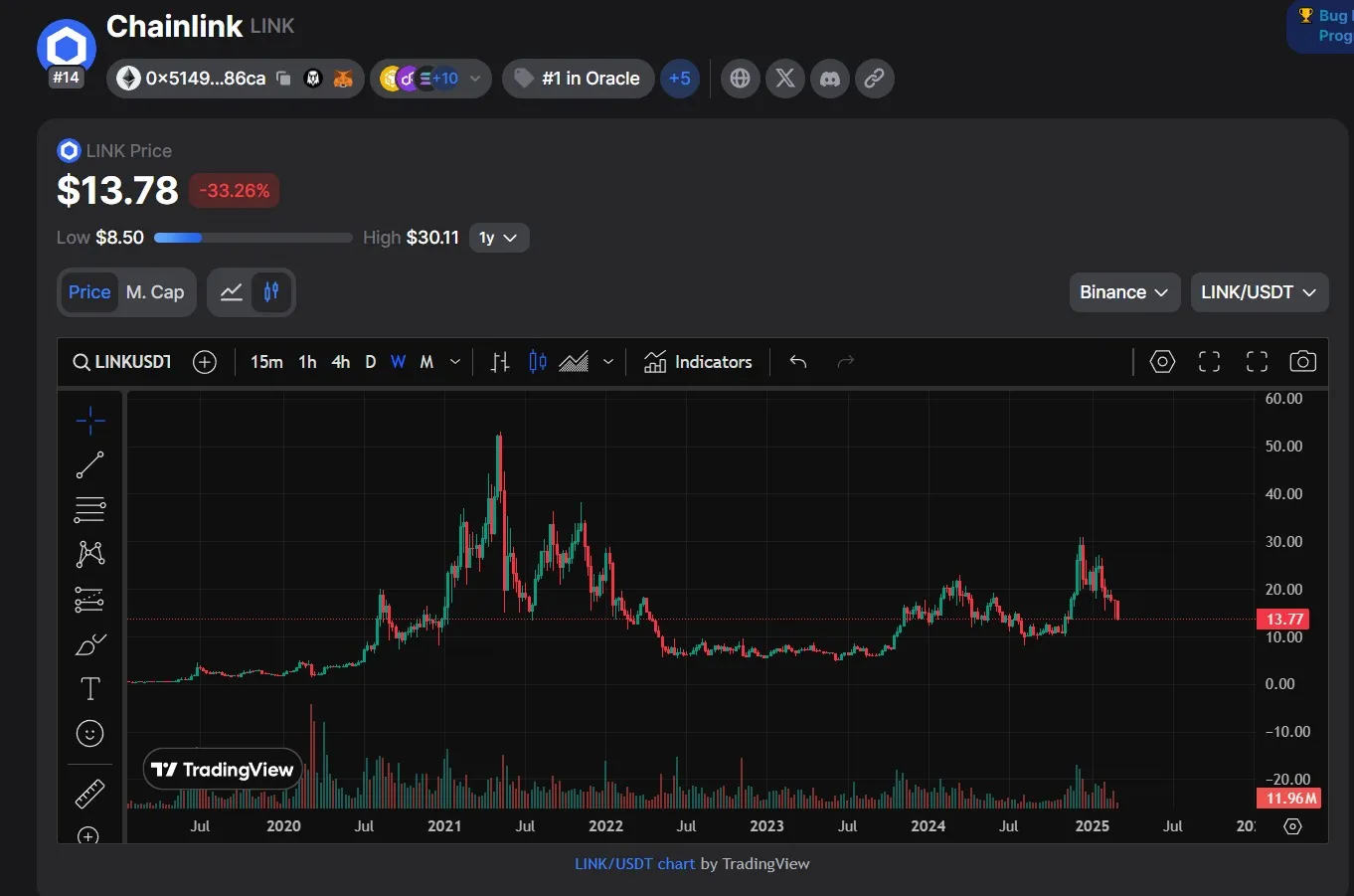 Chainlink - одна з перших децентралізованих мереж оракулів, яка пов’язує блокчейн із зовнішніми даними. На відміну від традиційних криптовалют, LINK використовується для забезпечення роботи смарт-контрактів з надійними даними з реального світу.