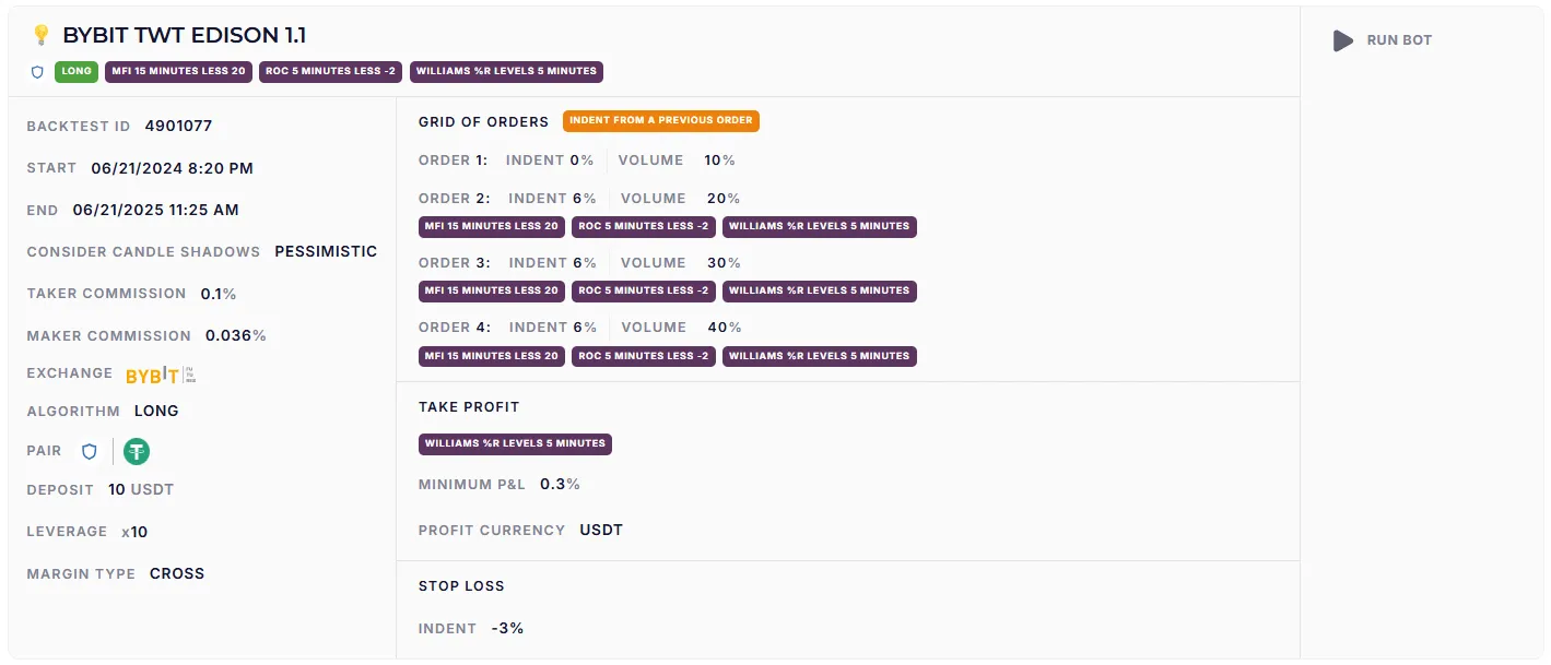 «Edison» працює на 15-х і 5-хвилинних таймфреймах, ловлячи точки входу завдяки простим, але ефективним індикаторам. W%R згладжує ринковий шум, мінімізуючи помилкові сигнали, що робить стратегію придатною для активів з високим коефіцієнтом ліквідності. Вона ефективна при глибоких проливах, дозволяючи отримувати прибуток від різких рухів.