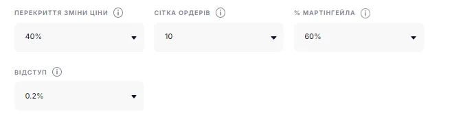 Використовуйте параметр Мартингейл для відсоткового збільшення обсягу ордерів у разі зниження ціни. Відповідно, якщо ви встановите в сітці 10 ордерів, то кожен з них збільшуватиметься в обсязі на 60%, і для відскоку до середньої ціни купівлі знадобиться менше зростання.