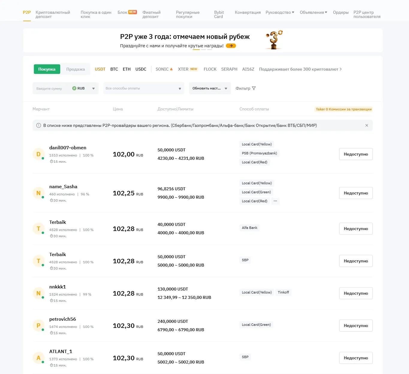 Використовуючи фільтри, підберіть продавця, вказавши бажані методи для оплати (Райффайзен, Сбербанк, Тінькофф), суму та відфільтруйте їх за кількістю успішно виконаних ордерів та рейтингом.