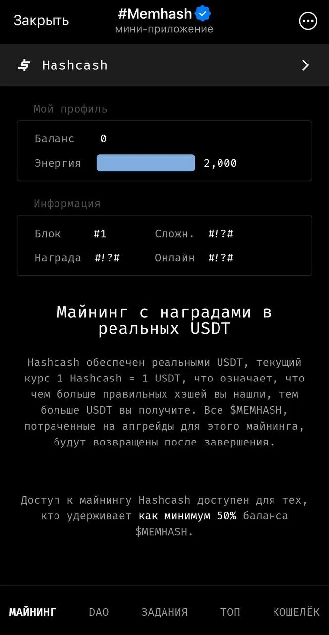 Memhash - це міні-додаток інтегрований у соціальну мережу Telegram. Проєкт являє собою систему майнінгу поінтів за рахунок потужностей процесора пристрою, з якого у користувача відкрито додаток Memhash. Майнінг не йде на постійній основі, а вмикається вручну на певну кількість енергії, запас якої можна збільшити в розділі Поліпшення. Також у додатку доступний лідерборд користувачів і розділ із завданнями, виконавши які можна отримати додаткові поінти.