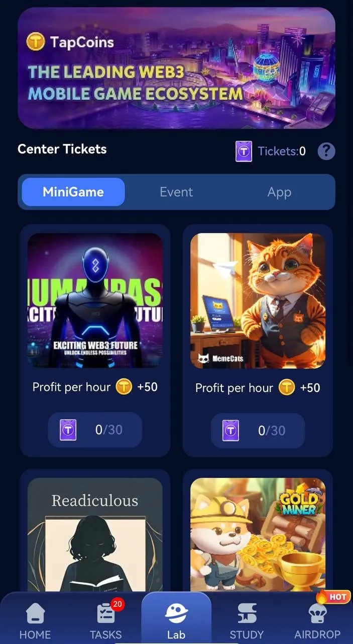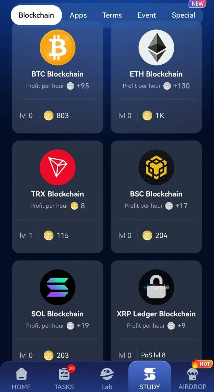 - Майнінг: У розділі «Study» користувачі можуть відкривати нові карти і покращувати їх, щоб збільшувати доходи з пасивного майнінгу.
