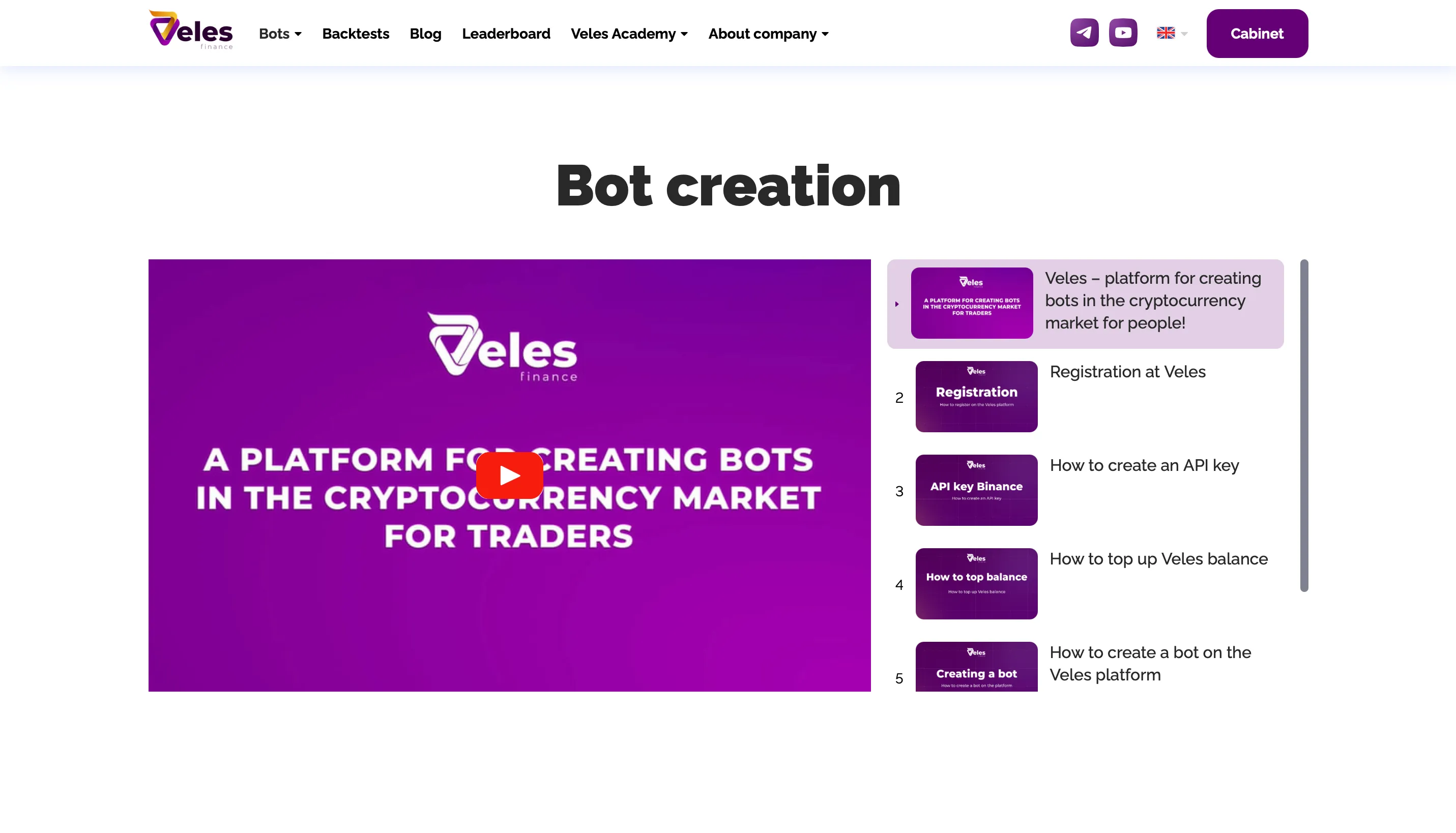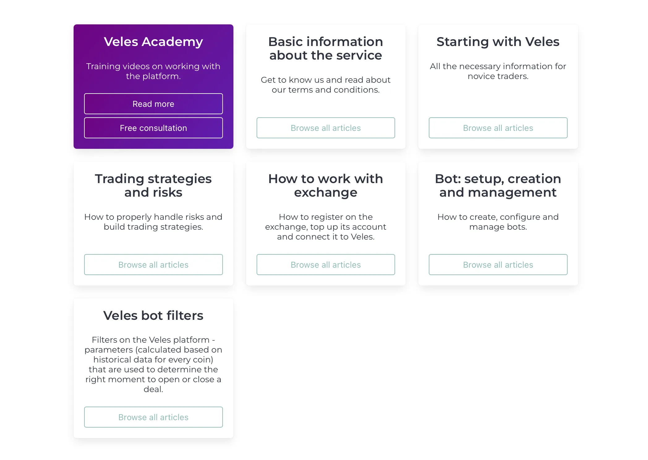 Якщо ви хочете зрозуміти, як ефективно використовувати торгового бота Veles, налаштувати стратегію і управляти ризиками, то найкраще почати з Veles Academy — навчального розділу платформи, який доступний на офіційному сайті Veles. Тут зібрані матеріали, що допомагають новачкам налаштувати кабінет і підключення до біржі, створити першого бота, розібратися в торгових індикаторах і навчитися застосовувати на практиці професійні стратегії.