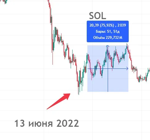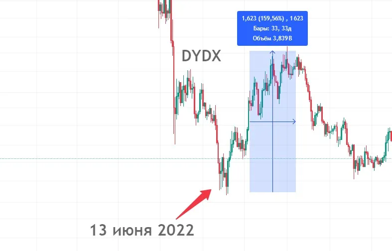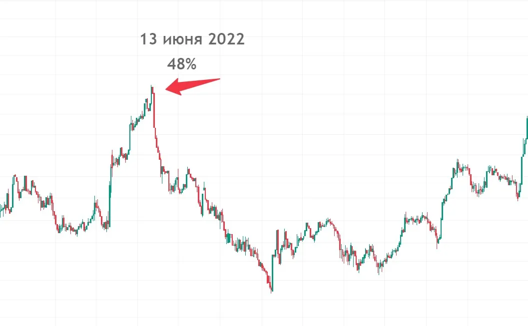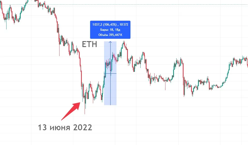 Один із прикладів був 13 червня 2022 року. Домінація біткоїна почала швидке зниження, що свідчило про вихід капіталу з активу. Цього ж дня ETH дав сильний рух більш ніж на 100%.