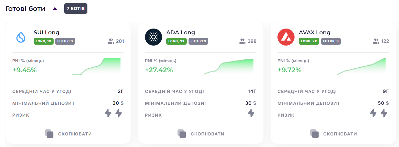 На платформі Veles доступні готові криптовалютні боти з налаштуваннями, які довели свою ефективність на практиці. Ці боти можуть заощадити час і зусилля трейдерів, надаючи їм готові стратегії, які вже показали позитивні результати.